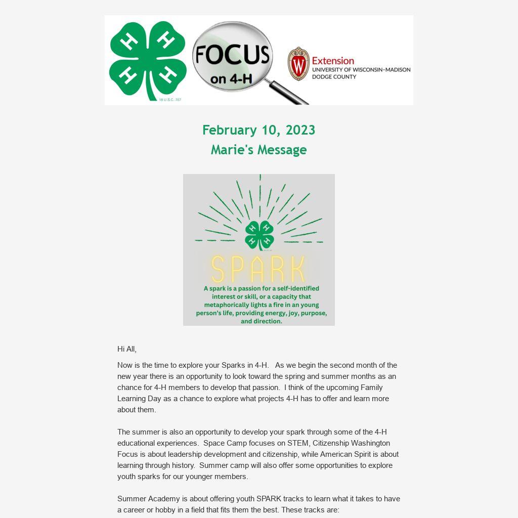 Now is the time to explore your Sparks in 4-H. As we begin the second month of the new year there is an opportunity to look toward the spring and summer months as an chance for 4-H members to develop that passion. I think of the upcoming Family Learning Day as a chance to explore what projects 4-H has to offer and learn more about them.
