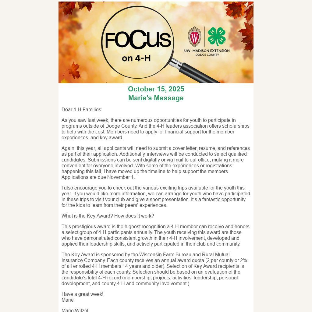 As you saw last week, there are numerous opportunities for youth to participate in programs outside of Dodge County. And the 4-H leaders association offers scholarships to help with the cost. Members need to apply for financial support for the member experiences, and key award.