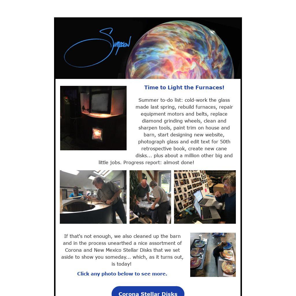 Summer to-do list: cold-work the glass made last spring, rebuild furnaces, repair equipment motors and belts, replace diamond grinding wheels, clean and sharpen tools, paint trim on house and barn, start designing new website, photograph glass and edit text for 50th retrospective book, create new cane disks... plus about a million other big and little jobs. Progress report: almost done!