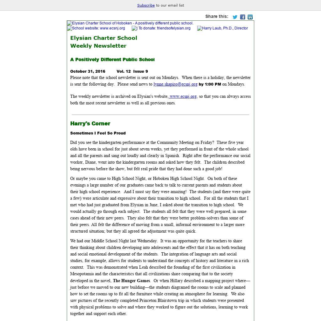 The weekly newsletter is archived on Elysian's website, www.ecsnj.org, so that you can always access both the most recent newsletter as well as all previous ones.