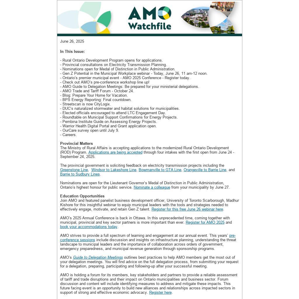*Disclaimer: The Association of Municipalities of Ontario (AMO) is unable to provide any warranty regarding the accuracy or completeness of third-party submissions. Distribution of these items does not imply an endorsement of the views, information or services mentioned.
