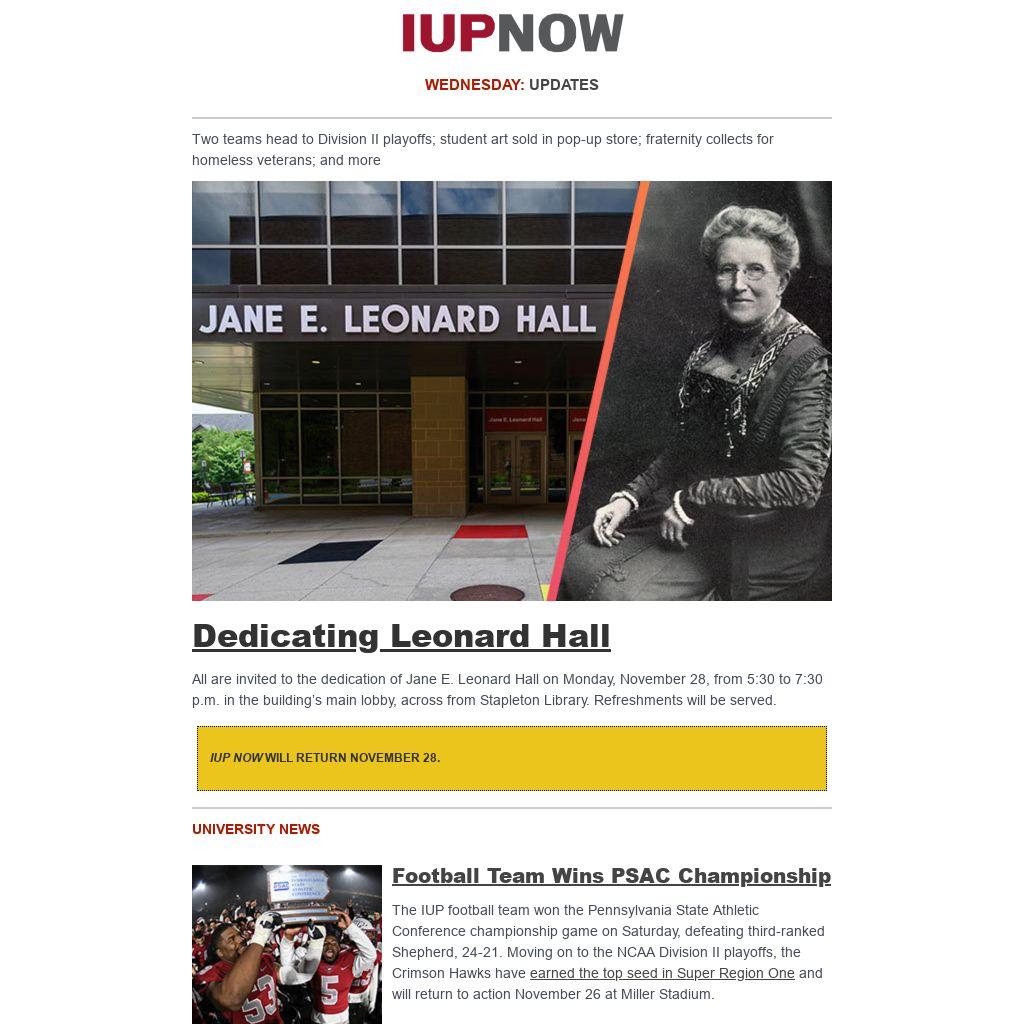 Distributed to IUP employees and students twice a week, IUP Now is the official newsletter of Indiana University of Pennsylvania. It features news from across the IUP website, compiled by the Division of Marketing and Communications. Find out how to get your news and events in IUP Now.