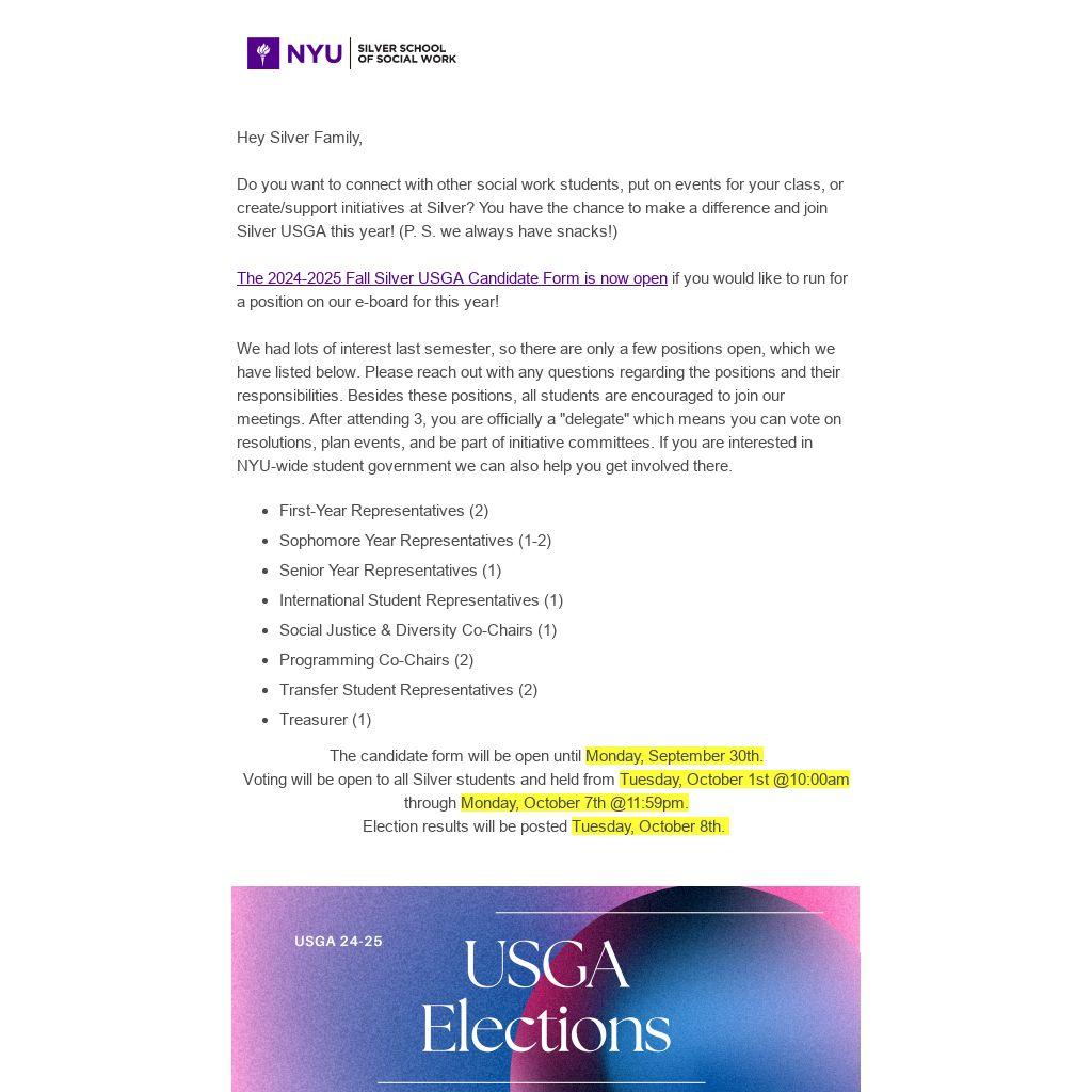 Do you want to connect with other social work students, put on events for your class, or create/support initiatives at Silver? You have the chance to make a difference and join Silver USGA this year! (P. S. we always have snacks!)