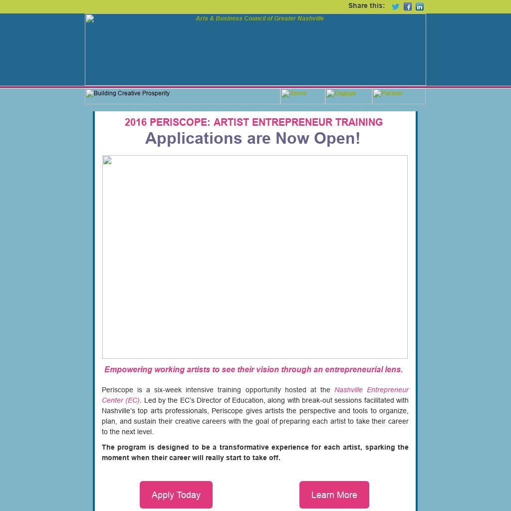 Periscope is a six-week intensive training opportunity hosted at the Nashville Entrepreneur Center (EC). Led by the EC’s Director of Education, along with break-out sessions facilitated with Nashville’s top arts professionals, Periscope gives artists the perspective and tools to organize, plan, and sustain their creative careers with the goal of preparing each artist to take their career to the next level.