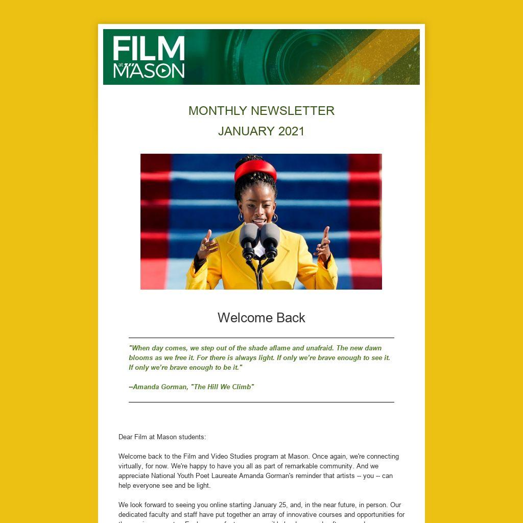 Welcome back to the Film and Video Studies program at Mason. Once again, we're connecting virtually, for now. We're happy to have you all as part of remarkable community. And we appreciate National Youth Poet Laureate Amanda Gorman's reminder that artists -- you -- can help everyone see and be light.