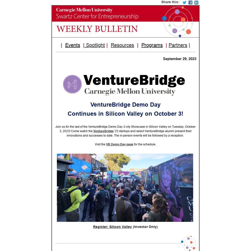 Have startup news or opportunities to share? Have questions about the Swartz Center Weekly Bulletin? Send news, opportunities or questions to Sonya Ford, Program Manager.