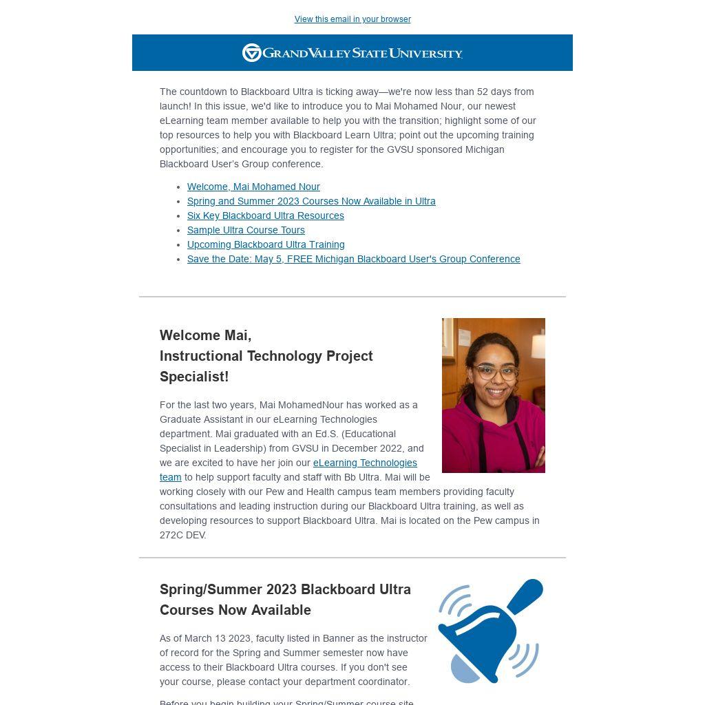 The countdown to Blackboard Ultra is ticking away—we're now less than 52 days from launch! In this issue, we'd like to introduce you to Mai Mohamed Nour, our newest eLearning team member available to help you with the transition; highlight some of our top resources to help you with Blackboard Learn Ultra; point out the upcoming training opportunities; and encourage you to register for the GVSU sponsored Michigan Blackboard User’s Group conference.