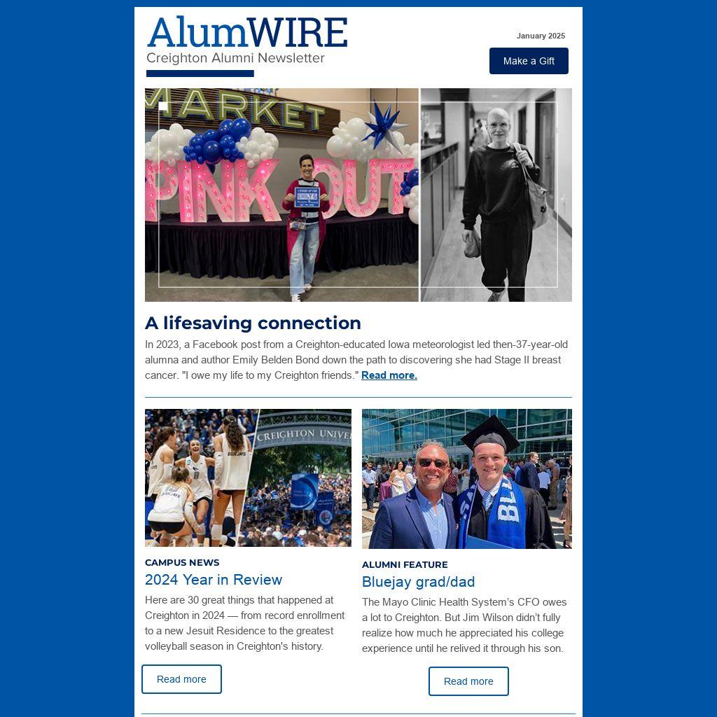 In 2023, a Facebook post from a Creighton-educated Iowa meteorologist led then-37-year-old alumna and author Emily Belden Bond down the path to discovering she had Stage II breast cancer. "I owe my life to my Creighton friends." Read more.