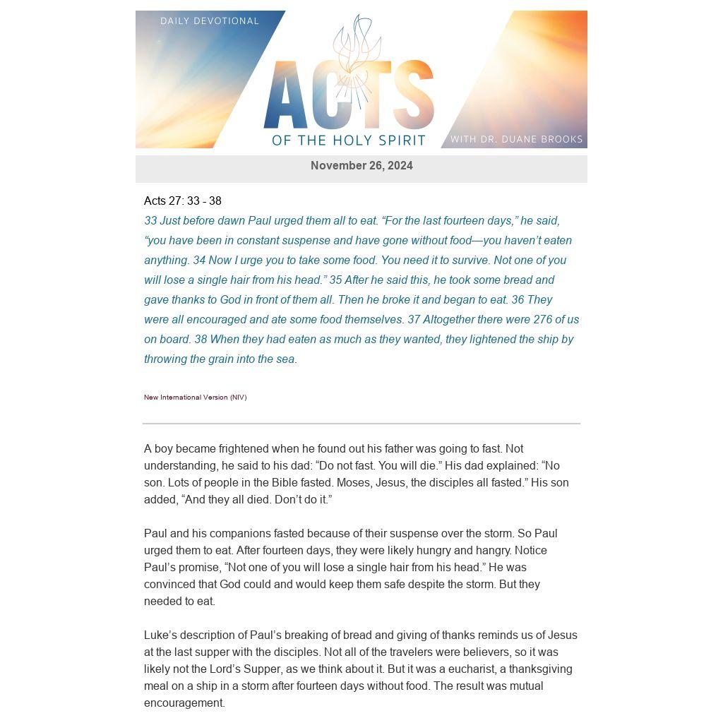 Paul and his companions fasted because of their suspense over the storm. So Paul urged them to eat. After fourteen days, they were likely hungry and hangry. Notice Paul’s promise, “Not one of you will lose a single hair from his head.” He was convinced that God could and would keep them safe despite the storm. But they needed to eat.
