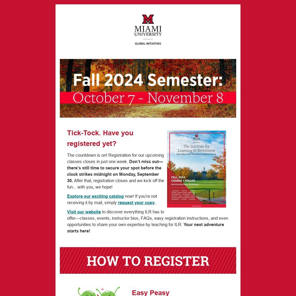 We make registering easy with three main options: online, by mail, or in person. As a last-minute convenience, we’re also offering phone registration at 513-529-8500. The fastest way to reserve your spot is through our quick and simple online registration—no passwords needed! Just click the "Register Now" button below. Prefer mail-in registration? Check out our catalog or visit our website for the forms.