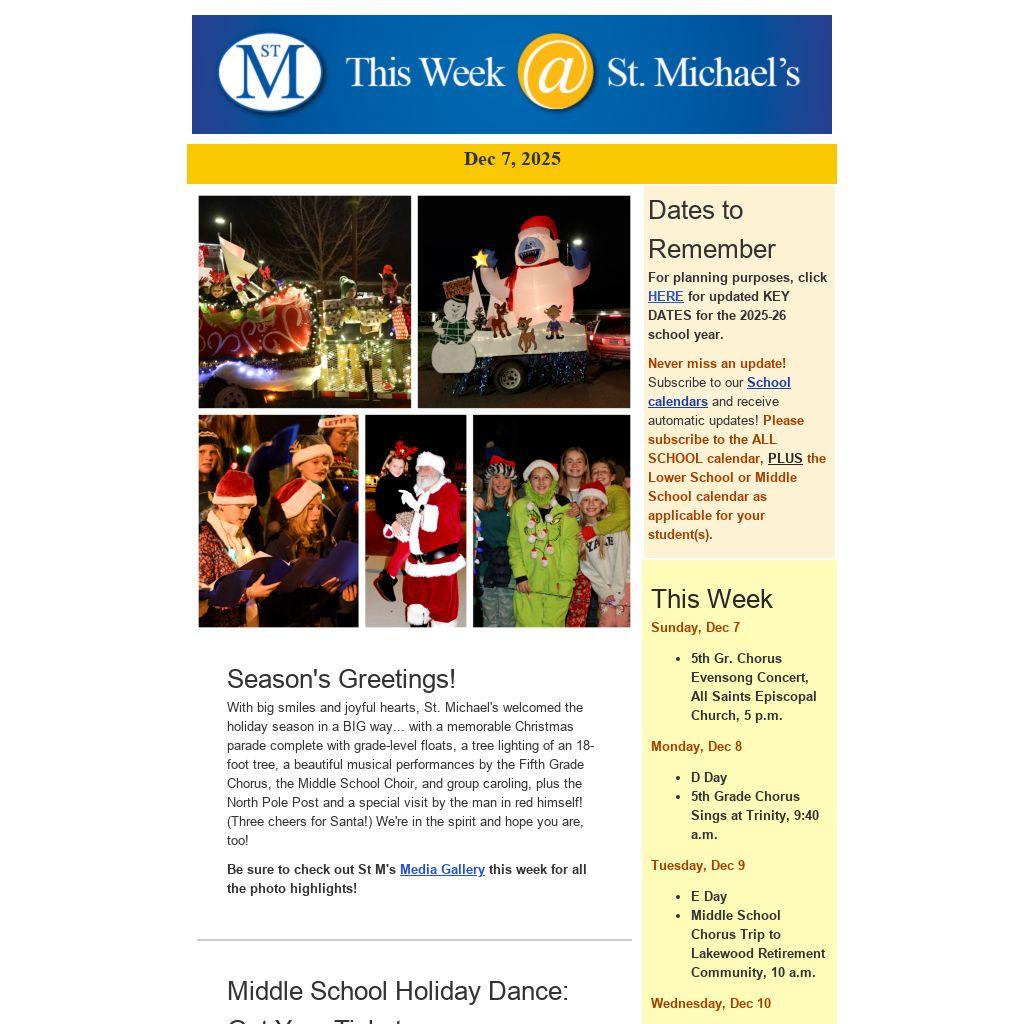 With big smiles and joyful hearts, St. Michael's welcomed the holiday season in a BIG way... with a memorable Christmas parade complete with grade-level floats, a tree lighting of an 18-foot tree, a beautiful musical performances by the Fifth Grade Chorus, the Middle School Choir, and group caroling, plus the North Pole Post and a special visit by the man in red himself! (Three cheers for Santa!) We're in the spirit and hope you are, too!