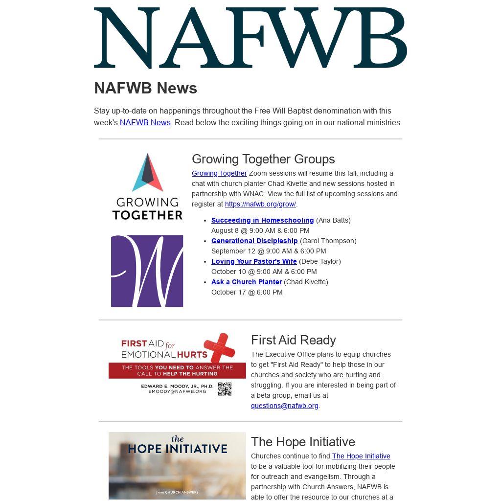 Growing Together Zoom sessions will resume this fall, including a chat with church planter Chad Kivette and new sessions hosted in partnership with WNAC. View the full list of upcoming sessions and register at https://nafwb.org/grow/.