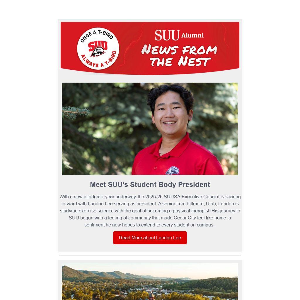 With a new academic year underway, the 2025-26 SUUSA Executive Council is soaring forward with Landon Lee serving as president. A senior from Fillmore, Utah, Landon is studying exercise science with the goal of becoming a physical therapist. His journey to SUU began with a feeling of community that made Cedar City feel like home, a sentiment he now hopes to extend to every student on campus.