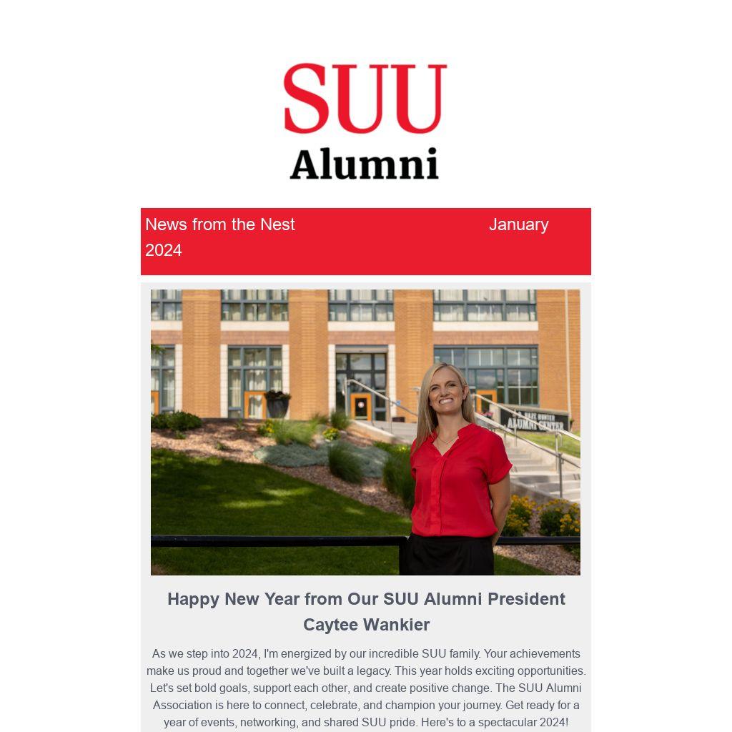 As we step into 2024, I'm energized by our incredible SUU family. Your achievements make us proud and together we've built a legacy. This year holds exciting opportunities. Let's set bold goals, support each other, and create positive change. The SUU Alumni Association is here to connect, celebrate, and champion your journey. Get ready for a year of events, networking, and shared SUU pride. Here's to a spectacular 2024!