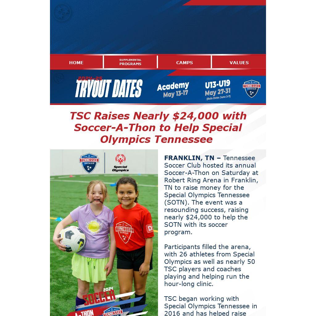 FRANKLIN, TN – Tennessee Soccer Club hosted its annual Soccer-A-Thon on Saturday at Robert Ring Arena in Franklin, TN to raise money for the Special Olympics Tennessee (SOTN). The event was a resounding success, raising nearly $24,000 to help the SOTN with its soccer program.