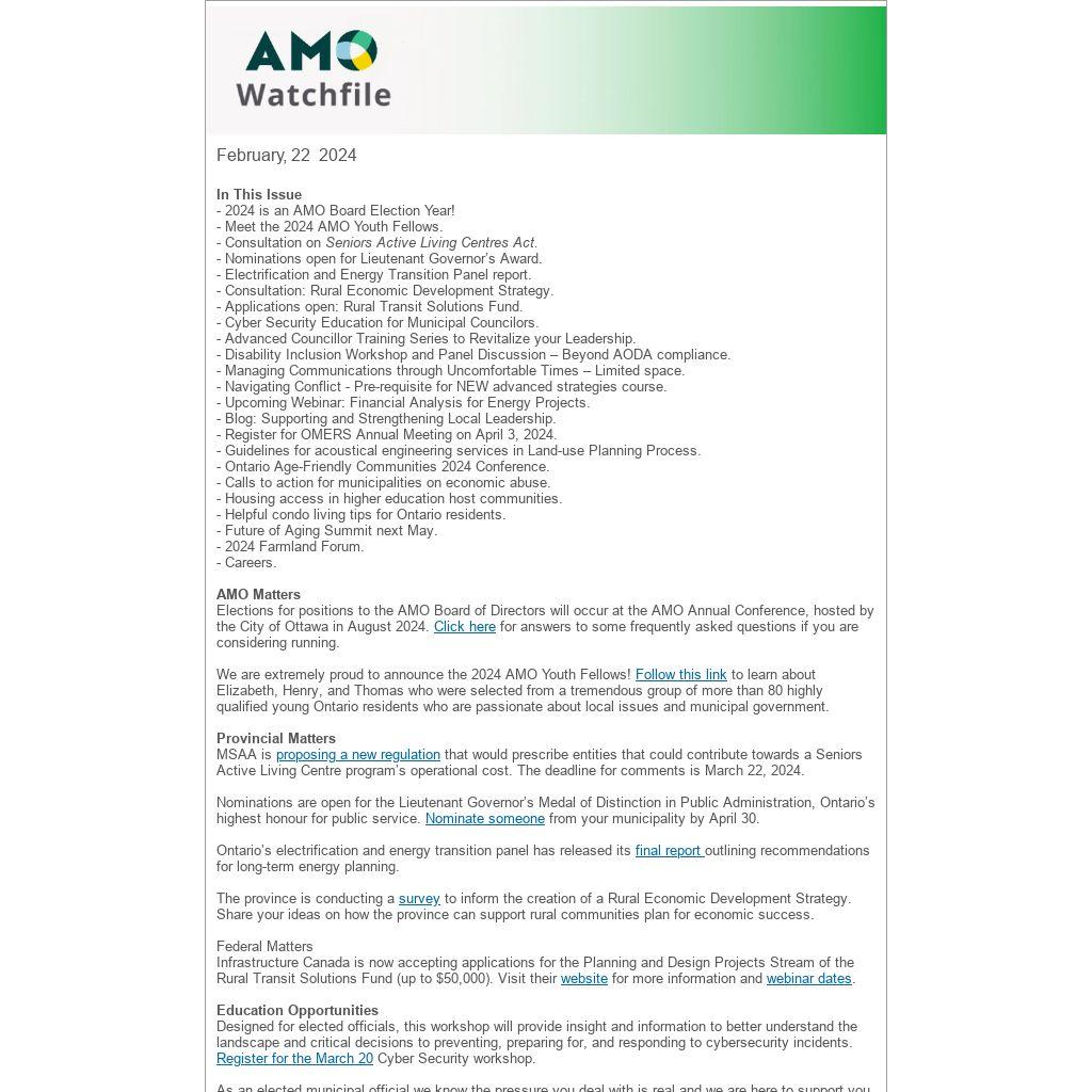 *Disclaimer: The Association of Municipalities of Ontario (AMO) is unable to provide any warranty regarding the accuracy or completeness of third-party submissions. Distribution of these items does not imply an endorsement of the views, information or services mentioned.