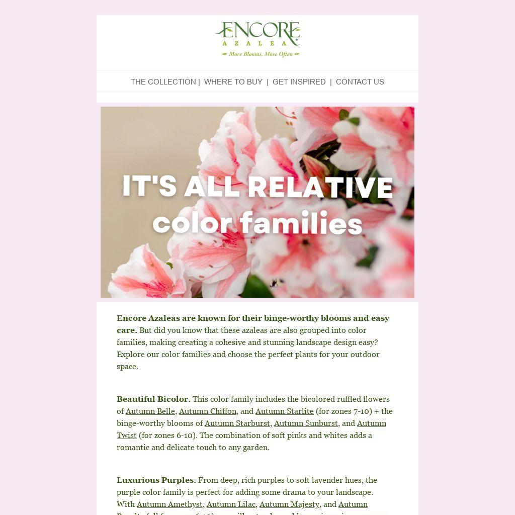 Encore Azaleas are known for their binge-worthy blooms and easy care. But did you know that these azaleas are also grouped into color families, making creating a cohesive and stunning landscape design easy? Explore our color families and choose the perfect plants for your outdoor space.