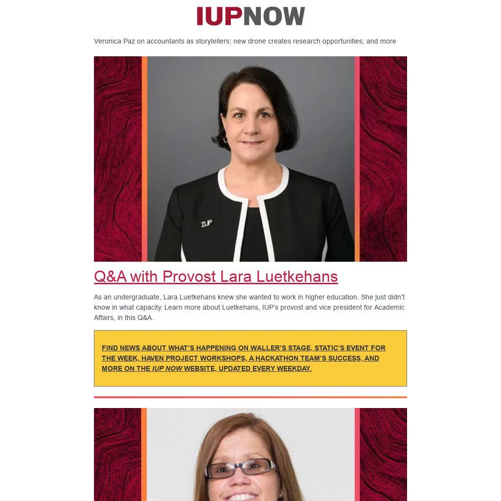 Distributed to employees and students once a week on Wednesdays, the IUP Now newsletter provides news highlights from across the university, compiled by the Office of Marketing and Communications. Find more news on the IUP Now website, updated every weekday. Find out how to get your news and events in IUP Now.