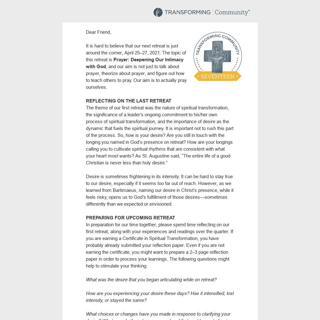 Small Groups. We will give you the opportunity to meet in small groups on this retreat but since the entire community will not be together in person, it is likely that we will have some shifting in the groups before we officially name them for the remainder of your community experience. As I mentioned during our last retreat, the process of assigning the small groups is covered with intercessory prayer, and we would appreciate your prayers regarding this important component of the Transforming Community experience. If any of you know other TC17 participants from any other area of your life (past or present church, community or employment), please reply to this email by Tuesday, April 20, so we will not place you in the same group. If you already did this at the last retreat or via email, thank you!