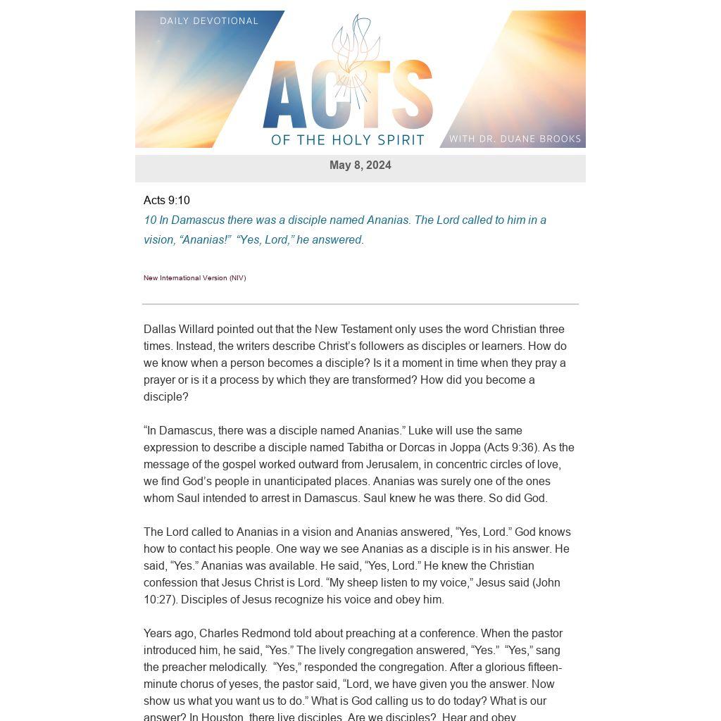 The Lord called to Ananias in a vision and Ananias answered, “Yes, Lord.” God knows how to contact his people. One way we see Ananias as a disciple is in his answer. He said, “Yes.” Ananias was available. He said, “Yes, Lord.” He knew the Christian confession that Jesus Christ is Lord. “My sheep listen to my voice,” Jesus said (John 10:27). Disciples of Jesus recognize his voice and obey him.