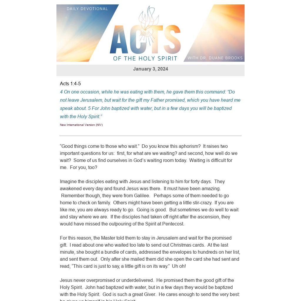 For this reason, the Master told them to stay in Jerusalem and wait for the promised gift. I read about one who waited too late to send out Christmas cards. At the last minute, she bought a bundle of cards, addressed the envelopes to hundreds on her list, and sent them out. Only after she mailed them did she open the card she had sent and read, “This card is just to say, a little gift is on its way.” Uh oh!