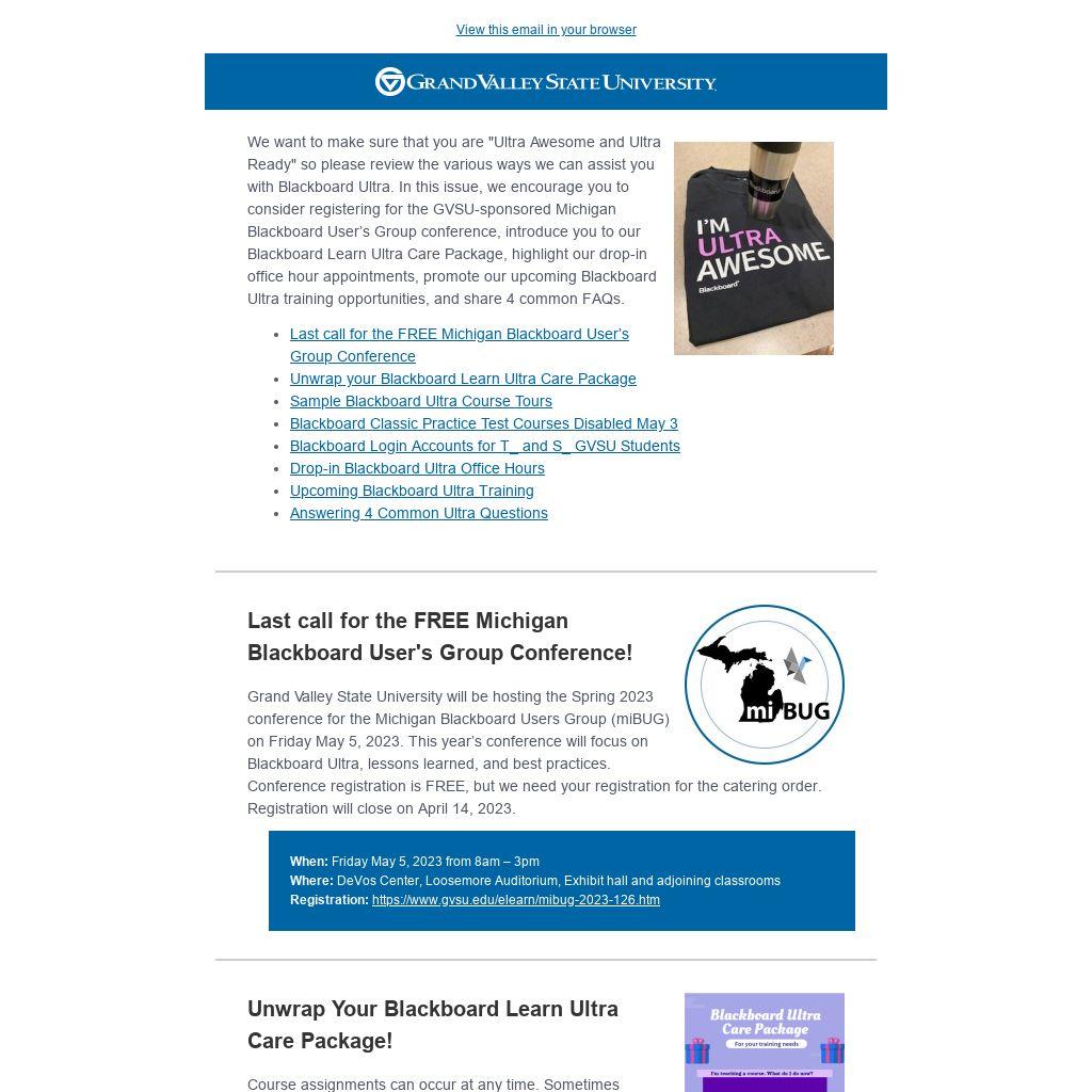 We also have two graduate assistants who are available Monday – Friday, 9am – 4pm to help with Ultra questions. Stop by KHS 4450 on the Allendale campus. Sam and Daniel will be available to answer questions. No appointment necessary.