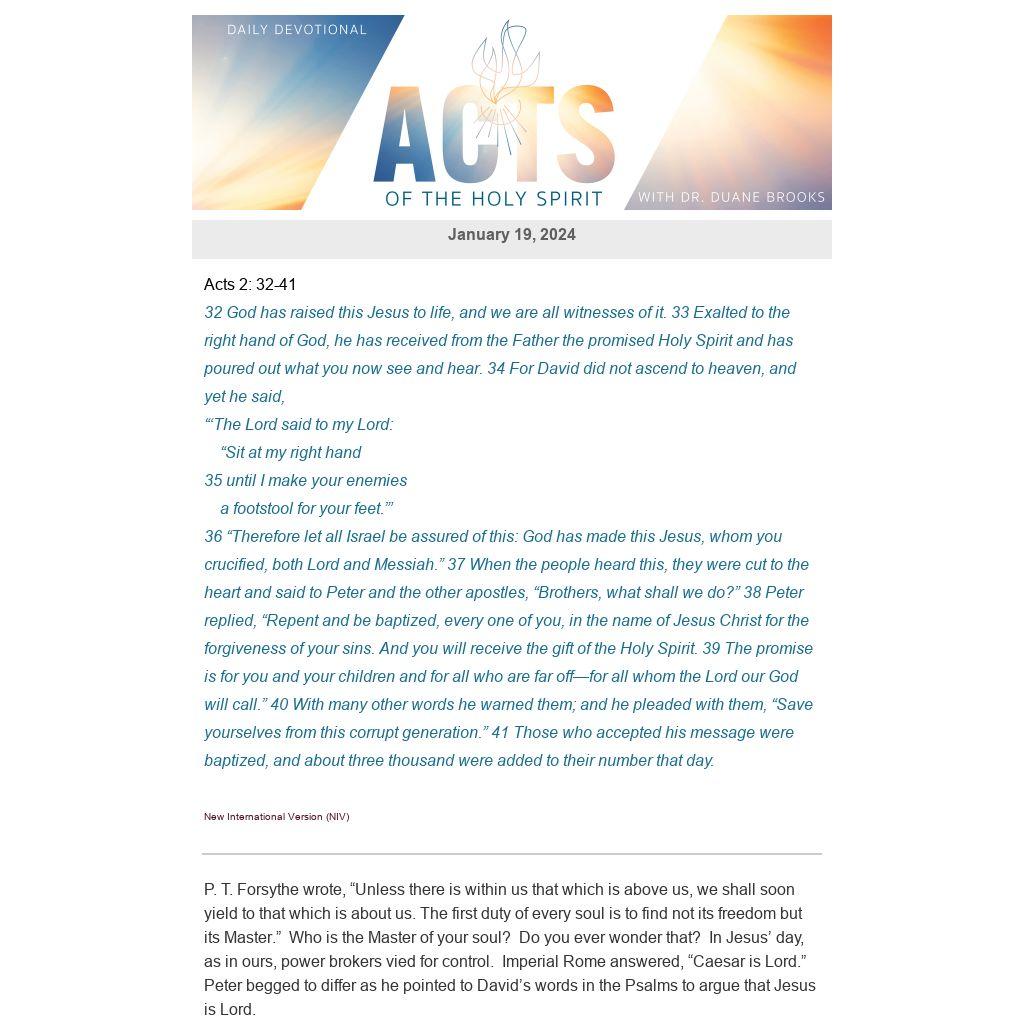 P. T. Forsythe wrote, “Unless there is within us that which is above us, we shall soon yield to that which is about us. The first duty of every soul is to find not its freedom but its Master.” Who is the Master of your soul? Do you ever wonder that? In Jesus’ day, as in ours, power brokers vied for control. Imperial Rome answered, “Caesar is Lord.” Peter begged to differ as he pointed to David’s words in the Psalms to argue that Jesus is Lord.