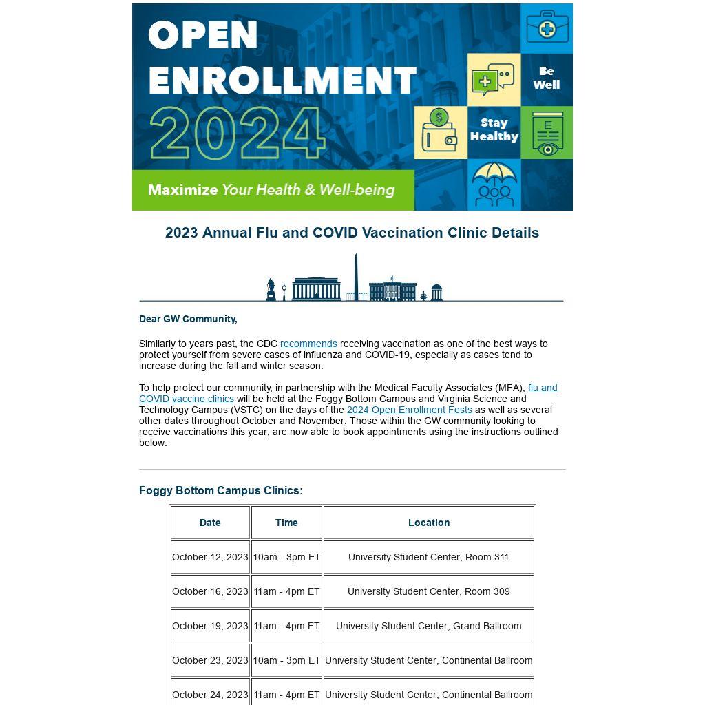 To help protect our community, in partnership with the Medical Faculty Associates (MFA), flu and COVID vaccine clinics will be held at the Foggy Bottom Campus and Virginia Science and Technology Campus (VSTC) on the days of the 2024 Open Enrollment Fests as well as several other dates throughout October and November. Those within the GW community looking to receive vaccinations this year, are now able to book appointments using the instructions outlined below.