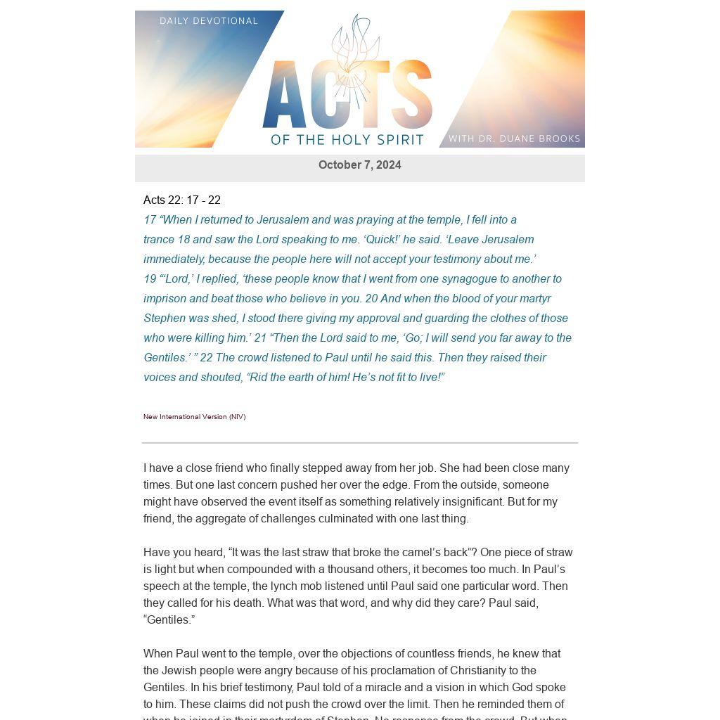 Have you heard, “It was the last straw that broke the camel’s back”? One piece of straw is light but when compounded with a thousand others, it becomes too much. In Paul’s speech at the temple, the lynch mob listened until Paul said one particular word. Then they called for his death. What was that word, and why did they care? Paul said, “Gentiles.”