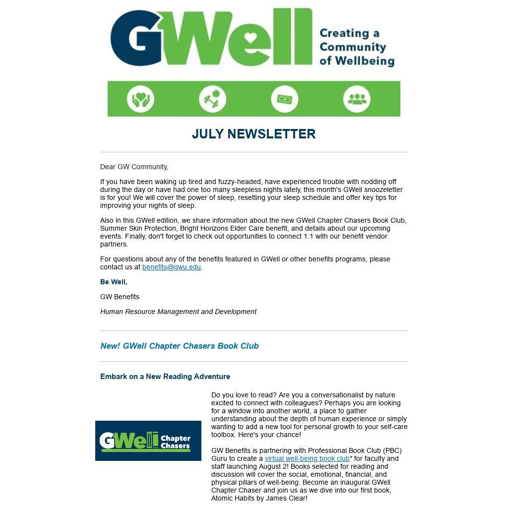 Also in this GWell edition, we share information about the new GWell Chapter Chasers Book Club, Summer Skin Protection, Bright Horizons Elder Care benefit, and details about our upcoming events. Finally, don't forget to check out opportunities to connect 1:1 with our benefit vendor partners.