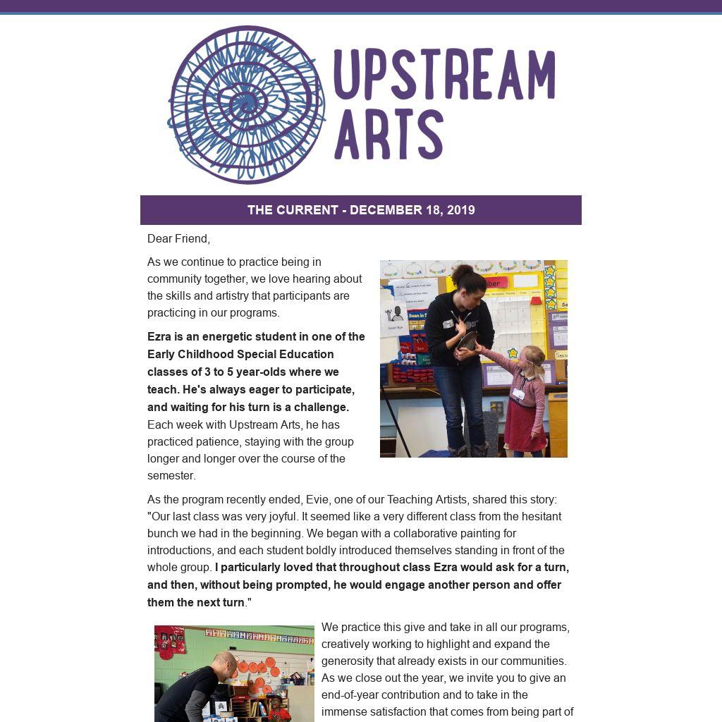 Ezra is an energetic student in one of the Early Childhood Special Education classes of 3 to 5 year-olds where we teach. He's always eager to participate, and waiting for his turn is a challenge. Each week with Upstream Arts, he has practiced patience, staying with the group longer and longer over the course of the semester.