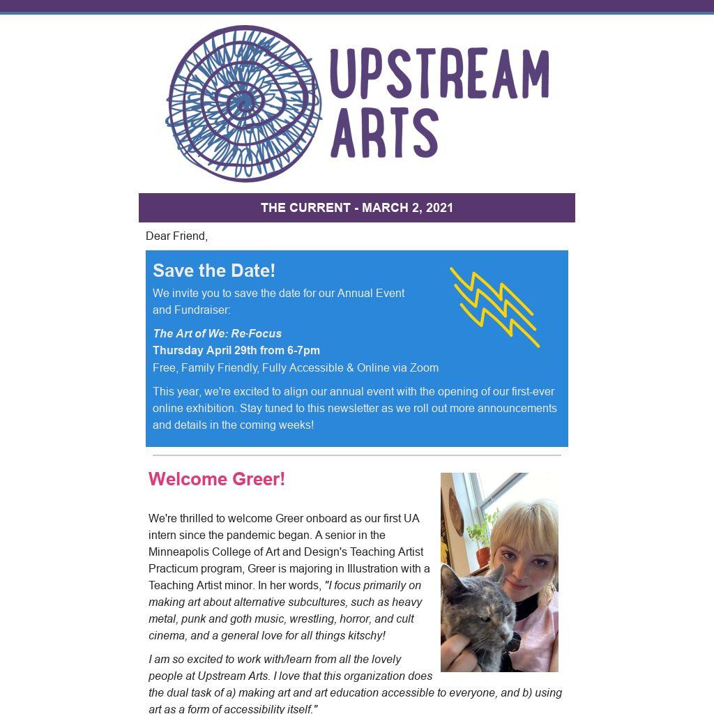 I am so excited to work with/learn from all the lovely people at Upstream Arts. I love that this organization does the dual task of a) making art and art education accessible to everyone, and b) using art as a form of accessibility itself."