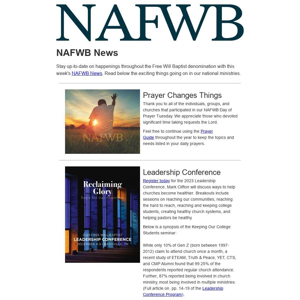 Stay up-to-date on happenings throughout the Free Will Baptist denomination with this week's NAFWB News. Read below the exciting things going on in our national ministries.