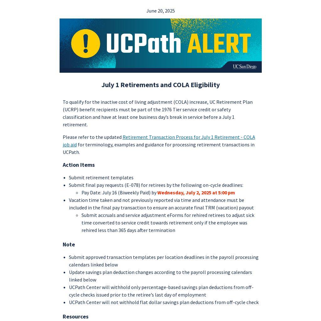 Please refer to the updated Retirement Transaction Process for July 1 Retirement - COLA job aid for terminology, examples and guidance for processing retirement transactions in UCPath.