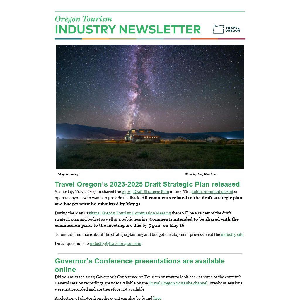 Governor’s Conference presentations are available onlineDid you miss the 2023 Governor’s Conference on Tourism or want to look back at some of the content? General session recordings are now available on the Travel Oregon YouTube channel. Breakout sessions were not recorded and are therefore not available.