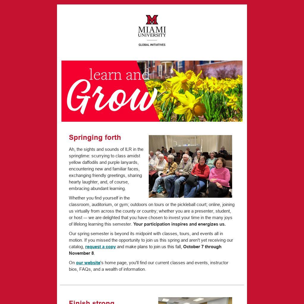 Finish strongYour instructors, lecturers, and class hosts are all volunteers. Please respect their time by making it a priority to attend all remaining sessions of your spring classes. You'll be glad you did!