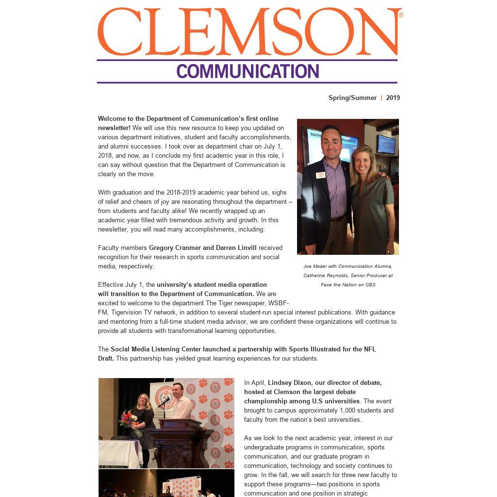 I encourage you to remain engaged with the Department of Communication by following us on Facebook (@ClemsonCOMM), Twitter (@ClemsonCOMM), and Instagram (@clemson_comm). We always enjoy learning about your accomplishments and continued success. News from our alumni, feedback from friends, and support can help us refine and further develop our programs to remain among the best in the state, region, and nation. We are grateful for your generous support. We also welcome your questions, suggestions, and visits to the Department of Communication. We hope to see you soon.