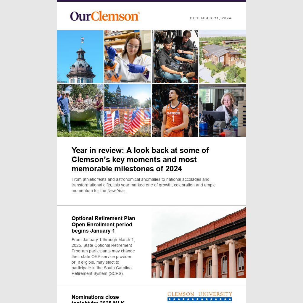 There will be no OUR Clemson this Thursday. OUR Clemson will return to its normal twice-weekly schedule on Tuesday, January 7.