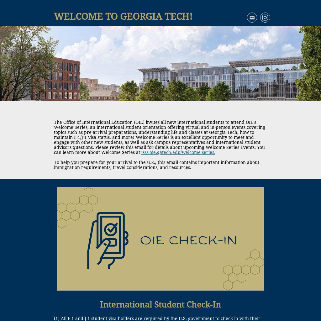 The Office of International Education (OIE) invites all new international students to attend OIE’s Welcome Series, an international student orientation offering virtual and in-person events covering topics such as pre-arrival preparations, understanding life and classes at Georgia Tech, how to maintain F-1/J-1 visa status, and more! Welcome Series is an excellent opportunity to meet and engage with other new students, as well as ask campus representatives and international student advisors questions. Please review this email for details about upcoming Welcome Series Events. You can learn more about Welcome Series at isss.oie.gatech.edu/welcome-series.