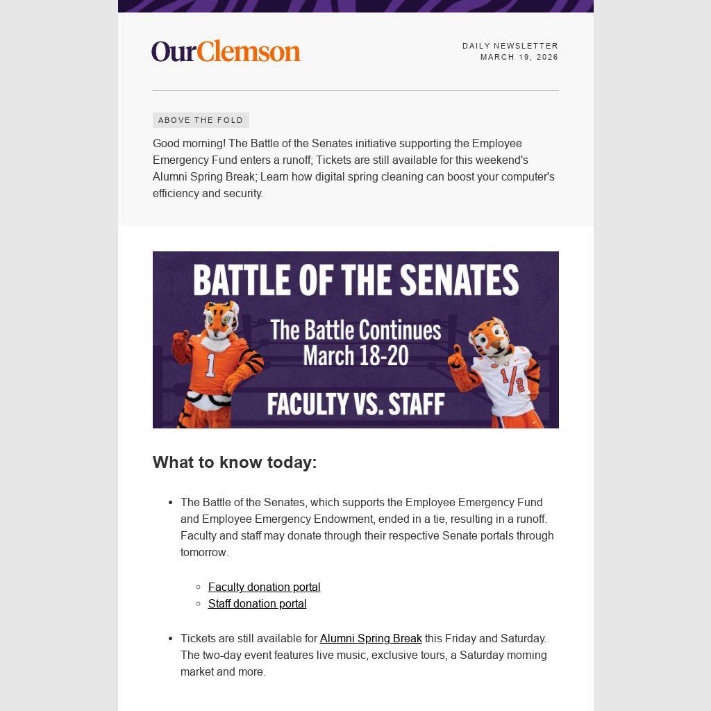 Good morning! The Battle of the Senates initiative supporting the Employee Emergency Fund enters a runoff; Tickets are still available for this weekend's Alumni Spring Break; Learn how digital spring cleaning can boost your computer's efficiency and security.