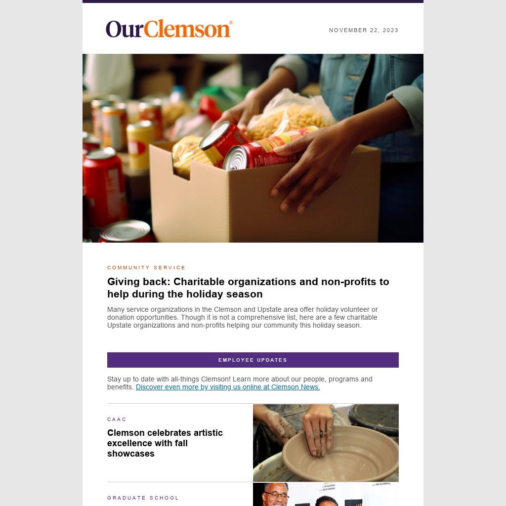 The last, tallest beam was installed at the Topping Out Ceremony at the Alumni and Visitors Center construction site on November 15, marking a major milestone on the project. Max Allen, Senior Vice President, Chief of Staff and Interim Vice President for Marketing and Communications, welcomed Pamela and Jeff Duckworth, President of the Clemson Alumni Association. Stephanie Cooper, the University’s Architect and Executive Director of Planning, Design and Construction, and Wil Brasington, Chief Executive Officer of the Alumni Association, signed the beam prior to its installation.