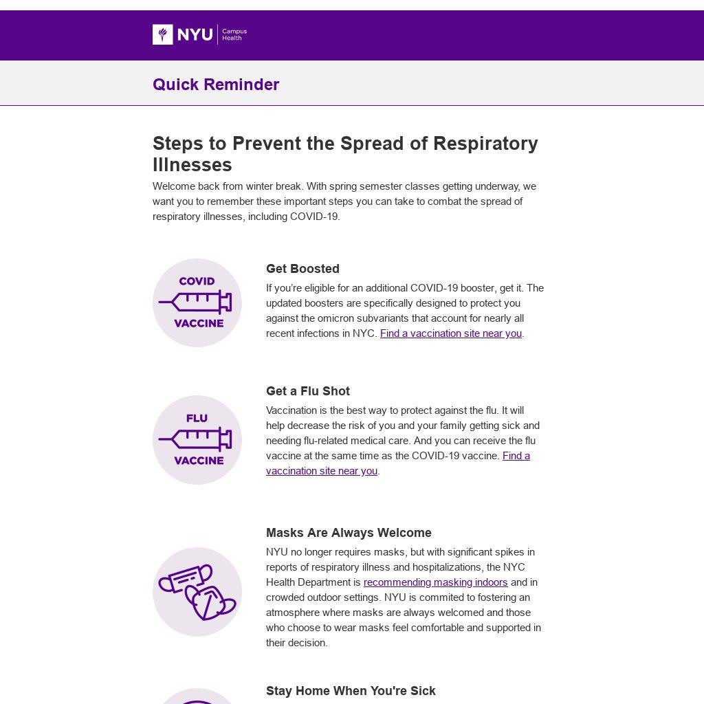 Welcome back from winter break. With spring semester classes getting underway, we want you to remember these important steps you can take to combat the spread of respiratory illnesses, including COVID-19.