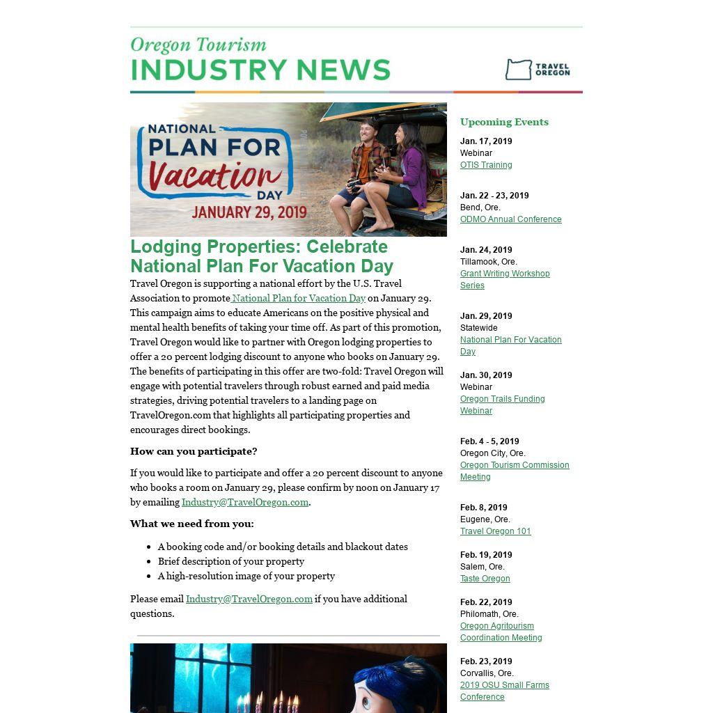 Lodging Properties: Celebrate National Plan For Vacation DayTravel Oregon is supporting a national effort by the U.S. Travel Association to promote National Plan for Vacation Day on January 29. This campaign aims to educate Americans on the positive physical and mental health benefits of taking your time off. As part of this promotion, Travel Oregon would like to partner with Oregon lodging properties to offer a 20 percent lodging discount to anyone who books on January 29. The benefits of participating in this offer are two-fold: Travel Oregon will engage with potential travelers through robust earned and paid media strategies, driving potential travelers to a landing page on TravelOregon.com that highlights all participating properties and encourages direct bookings. How can you participate? If you would like to participate and offer a 20 percent discount to anyone who books a room on January 29, please confirm by noon on January 17 by emailing Industry@TravelOregon.com. What we need from you: - A booking code and/or booking details and blackout dates