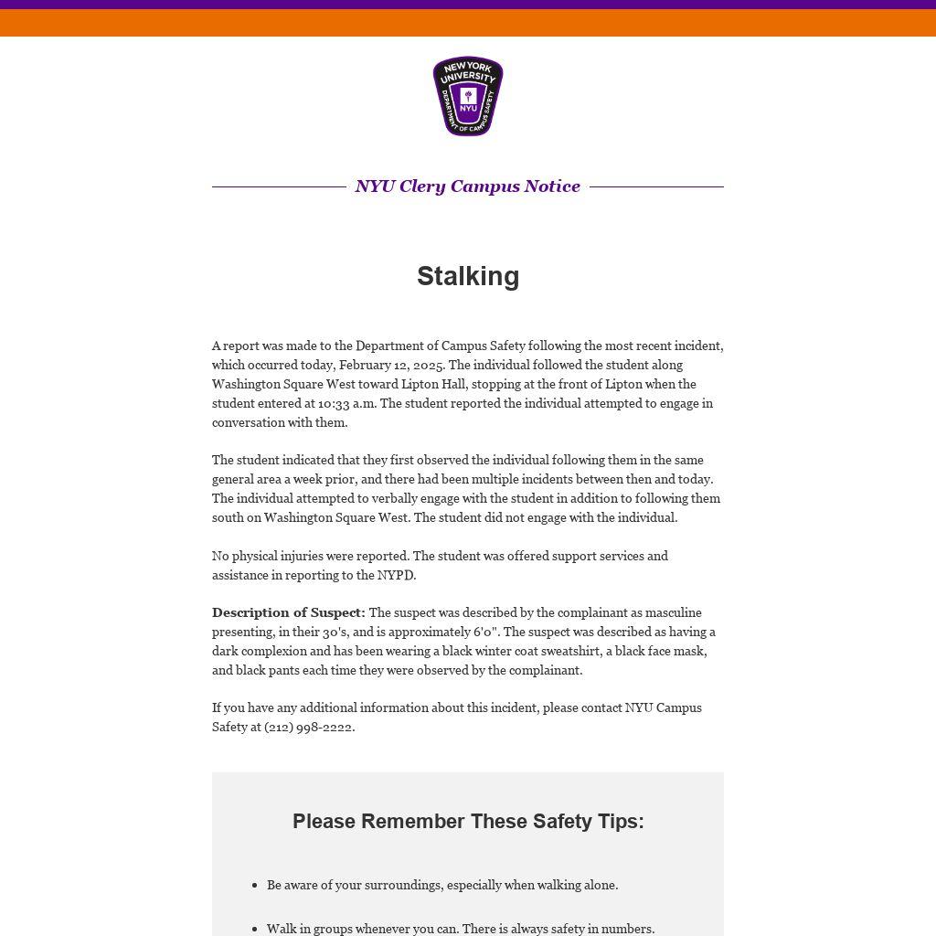 A report was made to the Department of Campus Safety following the most recent incident, which occurred today, February 12, 2025. The individual followed the student along Washington Square West toward Lipton Hall, stopping at the front of Lipton when the student entered at 10:33 a.m. The student reported the individual attempted to engage in conversation with them.