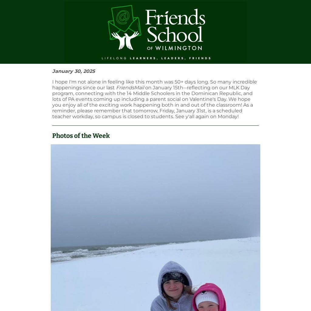 I hope I'm not alone in feeling like this month was 50+ days long. So many incredible happenings since our last FriendsMail on January 15th--reflecting on our MLK Day program, connecting with the 14 Middle Schoolers in the Dominican Republic, and lots of PA events coming up including a parent social on Valentine's Day. We hope you enjoy all of the exciting work happening both in and out of the classroom! As a reminder, please remember that tomorrow, Friday, January 31st, is a scheduled teacher workday, so campus is closed to students. See y'all again on Monday!