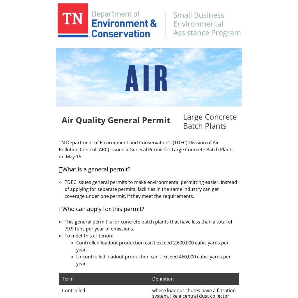 TN Department of Environment and Conservation’s (TDEC) Division of Air Pollution Control (APC) issued a General Permit for Large Concrete Batch Plants on May 16.