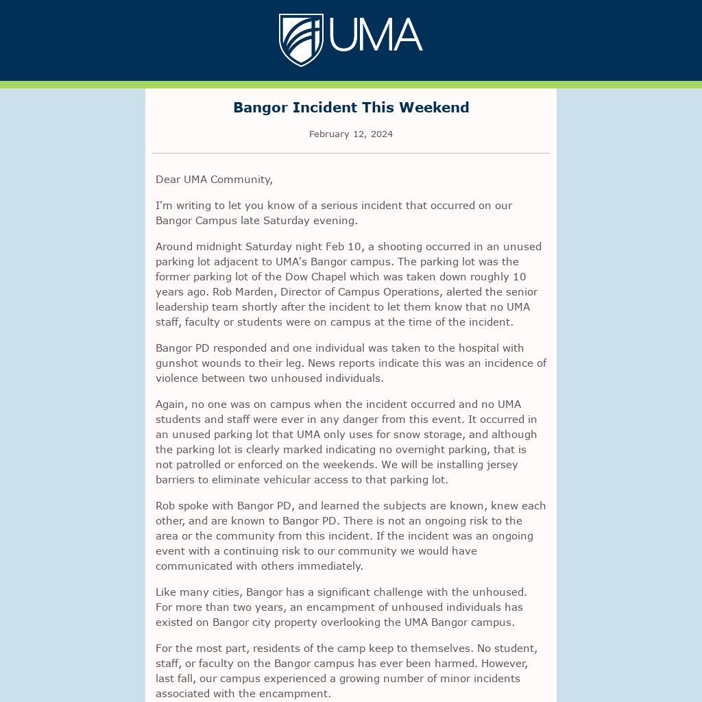 Around midnight Saturday night Feb 10, a shooting occurred in an unused parking lot adjacent to UMA's Bangor campus. The parking lot was the former parking lot of the Dow Chapel which was taken down roughly 10 years ago. Rob Marden, Director of Campus Operations, alerted the senior leadership team shortly after the incident to let them know that no UMA staff, faculty or students were on campus at the time of the incident.
