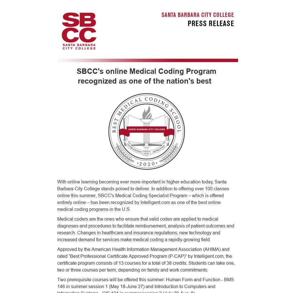 With online learning becoming ever more important in higher education today, Santa Barbara City College stands poised to deliver. In addition to offering over 100 classes online this summer, SBCC's Medical Coding Specialist Program – which is offered entirely online – has been recognized by Intelligent.com as one of the best online medical coding programs in the U.S.