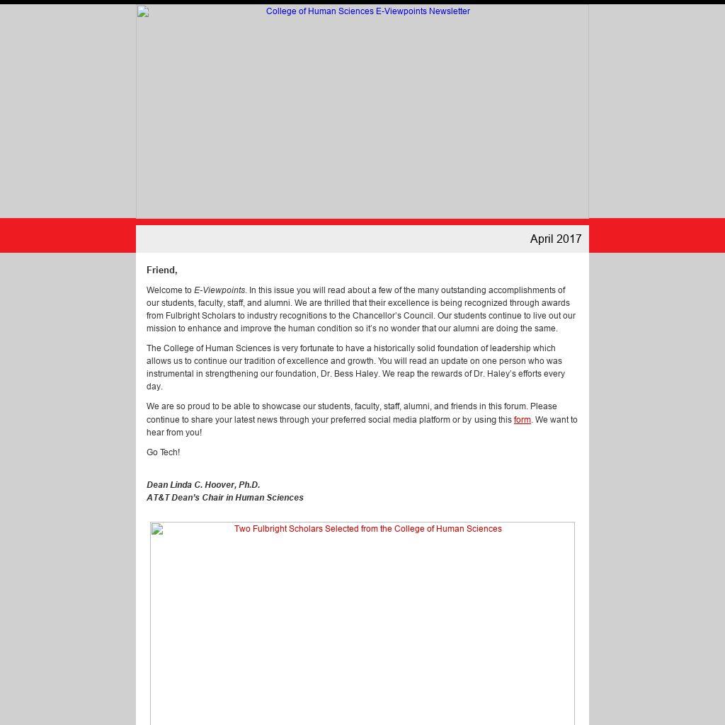 Friend, Welcome to E-Viewpoints. In this issue you will read about a few of the many outstanding accomplishments of our students, faculty, staff, and alumni. We are thrilled that their excellence is being recognized through awards from Fulbright Scholars to industry recognitions to the Chancellor’s Council. Our students continue to live out our mission to enhance and improve the human condition so it’s no wonder that our alumni are doing the same. The College of Human Sciences is very fortunate to have a historically solid foundation of leadership which allows us to continue our tradition of excellence and growth. You will read an update on one person who was instrumental in strengthening our foundation, Dr. Bess Haley. We reap the rewards of Dr. Haley’s efforts every day. We are so proud to be able to showcase our students, faculty, staff, alumni, and friends in this forum. Please continue to share your latest news through your preferred social media platform or by using this form. We want to hear from you! Go Tech!