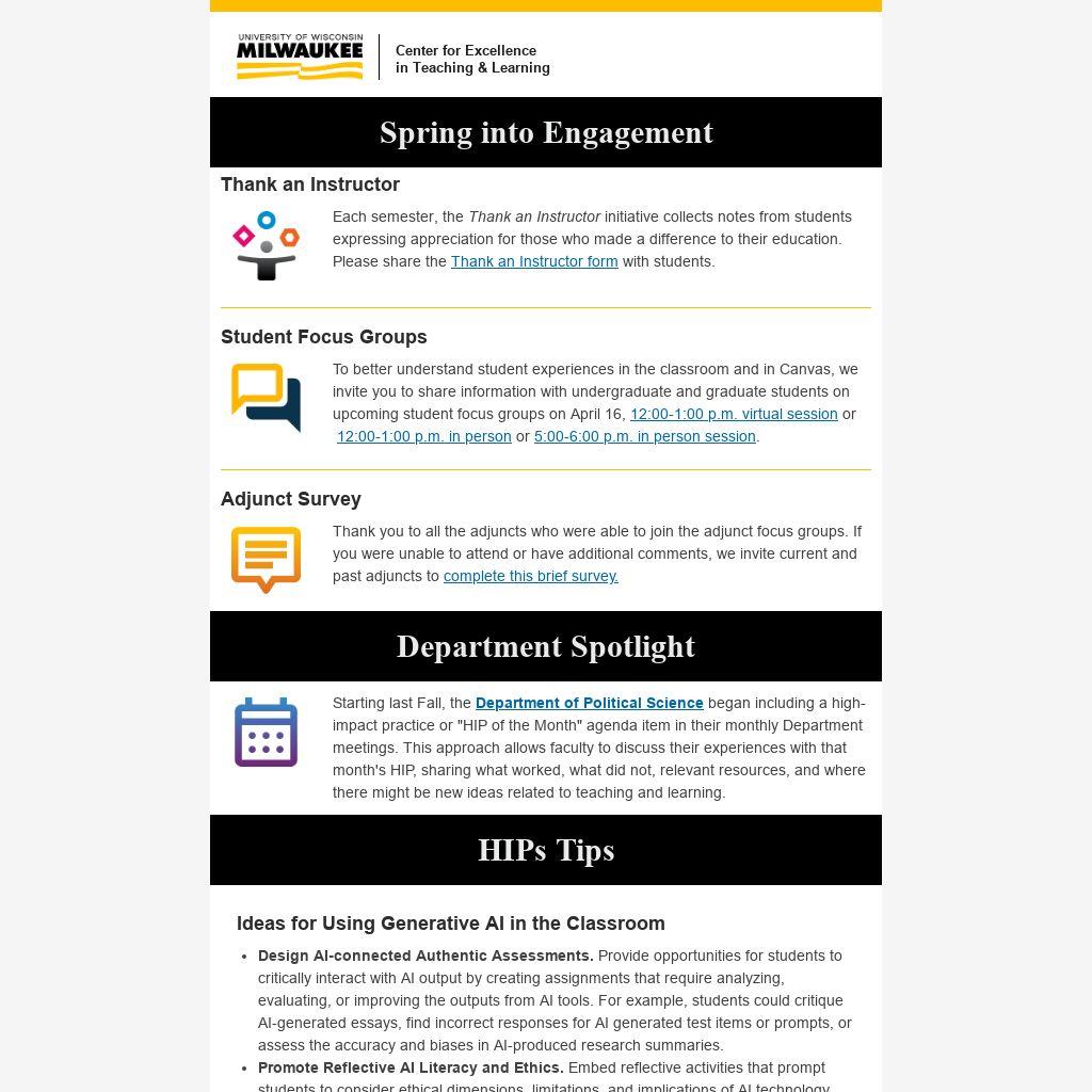 Starting last Fall, the Department of Political Science began including a high-impact practice or "HIP of the Month" agenda item in their monthly Department meetings. This approach allows faculty to discuss their experiences with that month's HIP, sharing what worked, what did not, relevant resources, and where there might be new ideas related to teaching and learning.